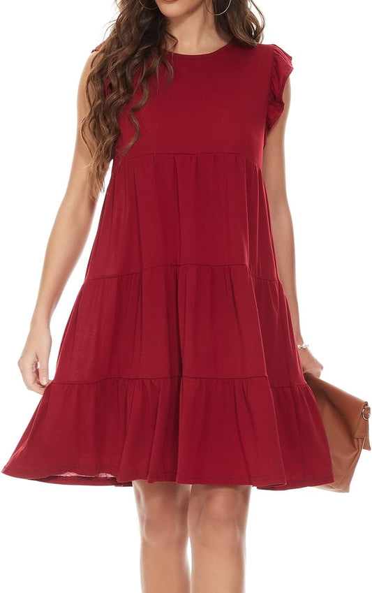 Women'S Summer Dress Sleeveless Ruffle Sleeve Sexy Crew Neck Mini Dress Western Loose Casual Dress Red L